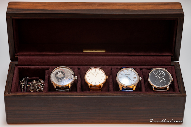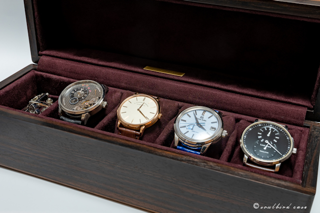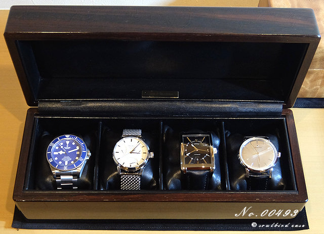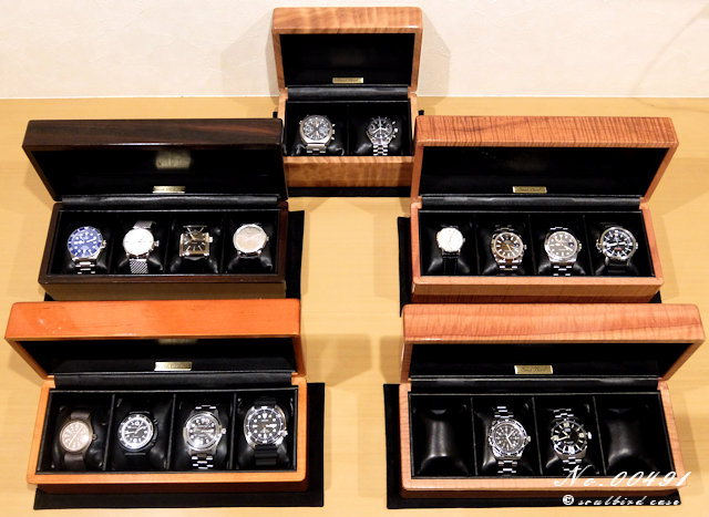 これまで4本用ケース、トレーの製作をお願いし大変満足して使っていたところ、予想外に妻の時計も増えてしまい、所有本数を収められるように今回再び オーダーさせて頂きました。